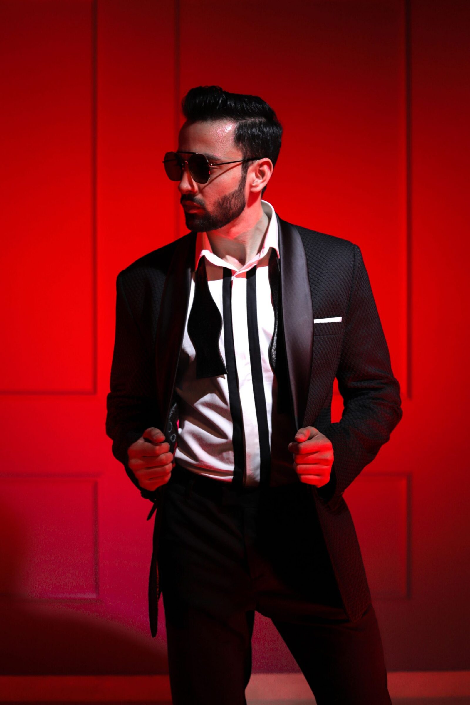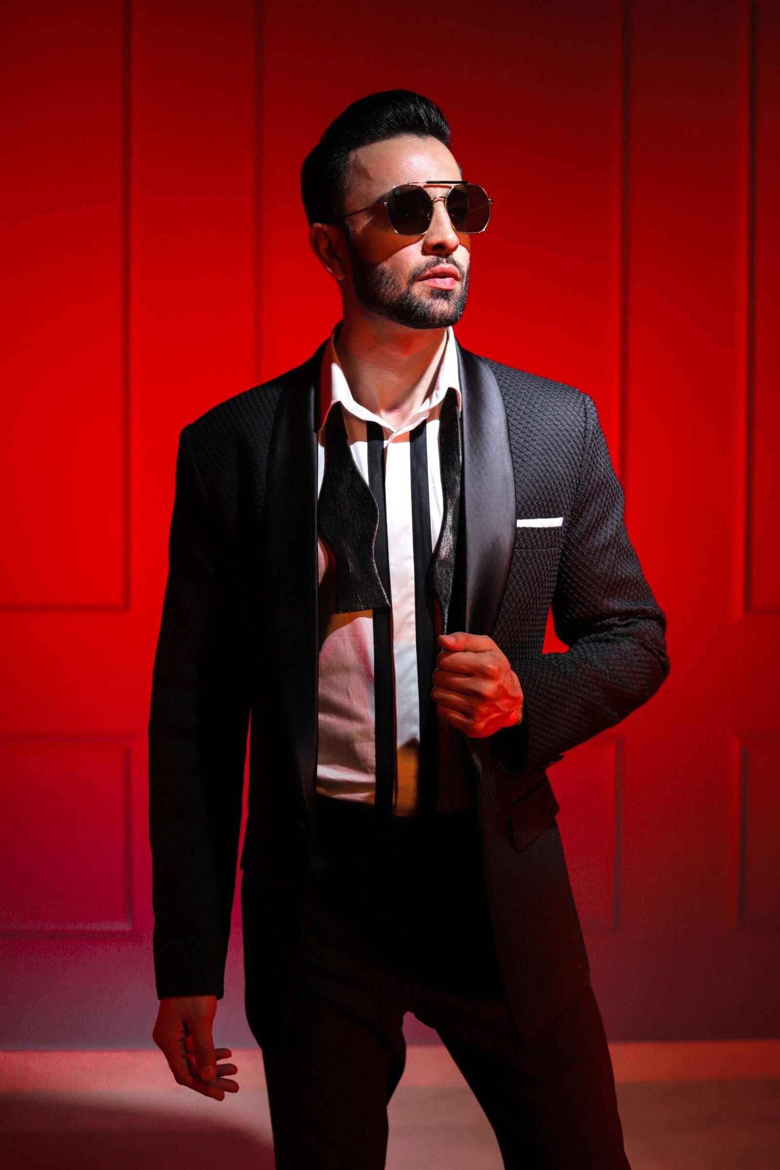 Black self weave tuxedo with stretch. Comes with jet black tuxedo trousers