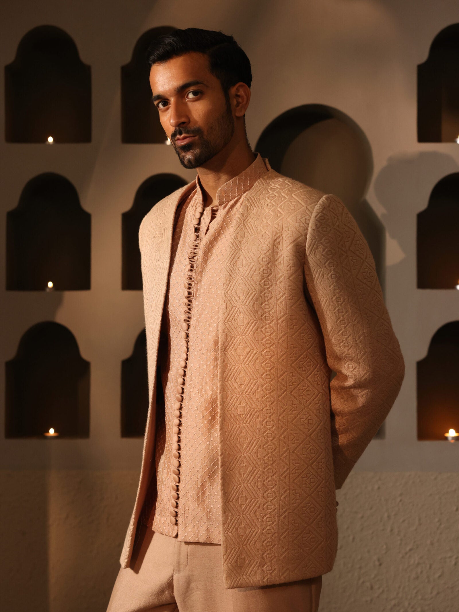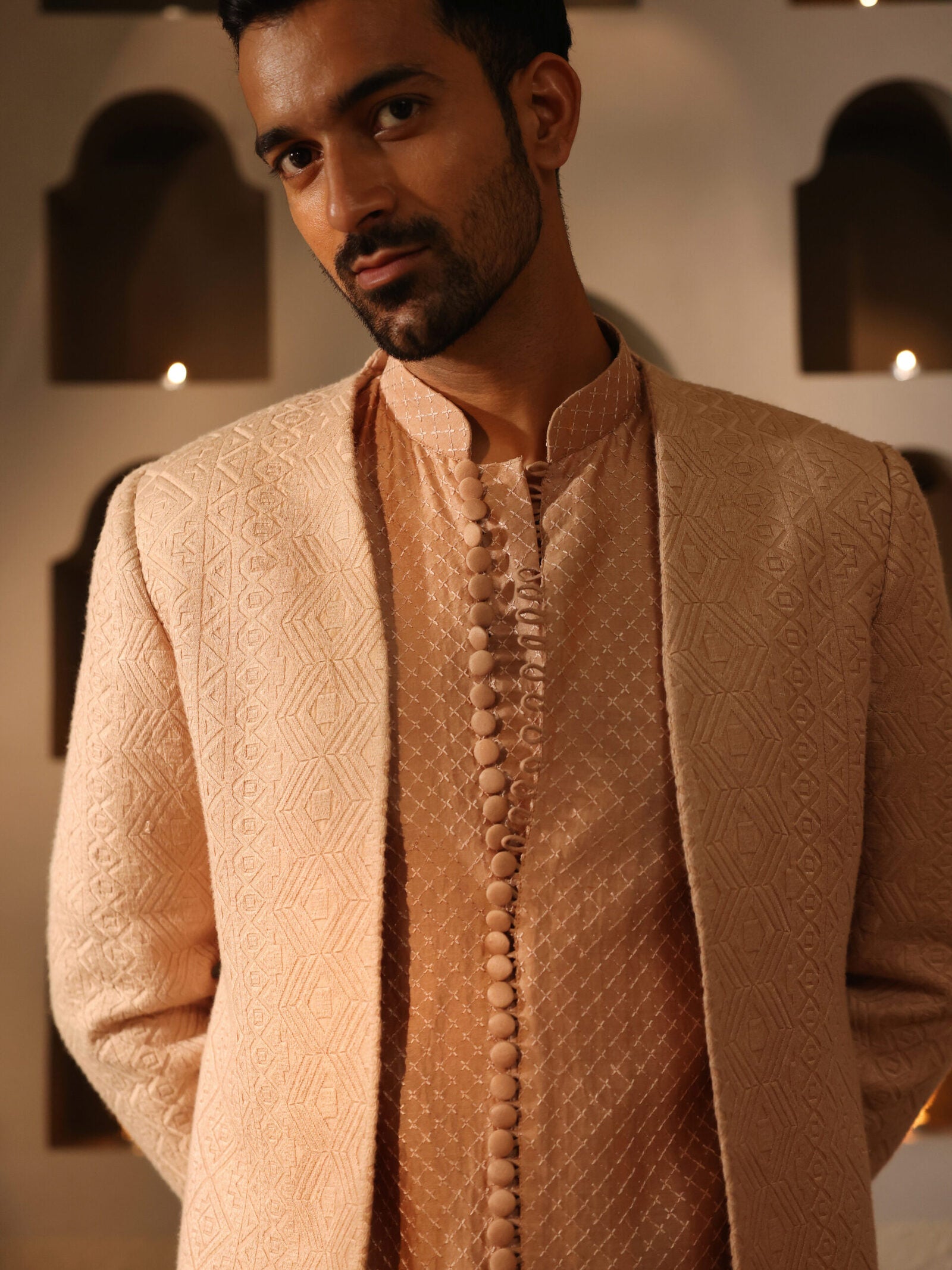 The Blush Royale Jodhpuri Suit is a sophisticated and stylish ensemble crafted for the modern gentleman. Featuring a beige cotton silk jacquard open bandhgala jacket, this suit combines luxurious fabric with exquisite detailing, ensuring a refined look. The patterned shirt kurta adds a contemporary touch, enhancing the overall elegance of the outfit. Perfect for weddings, receptions, or formal gatherings, this suit embodies grace and style, making it a must-have addition to any wardrobe.