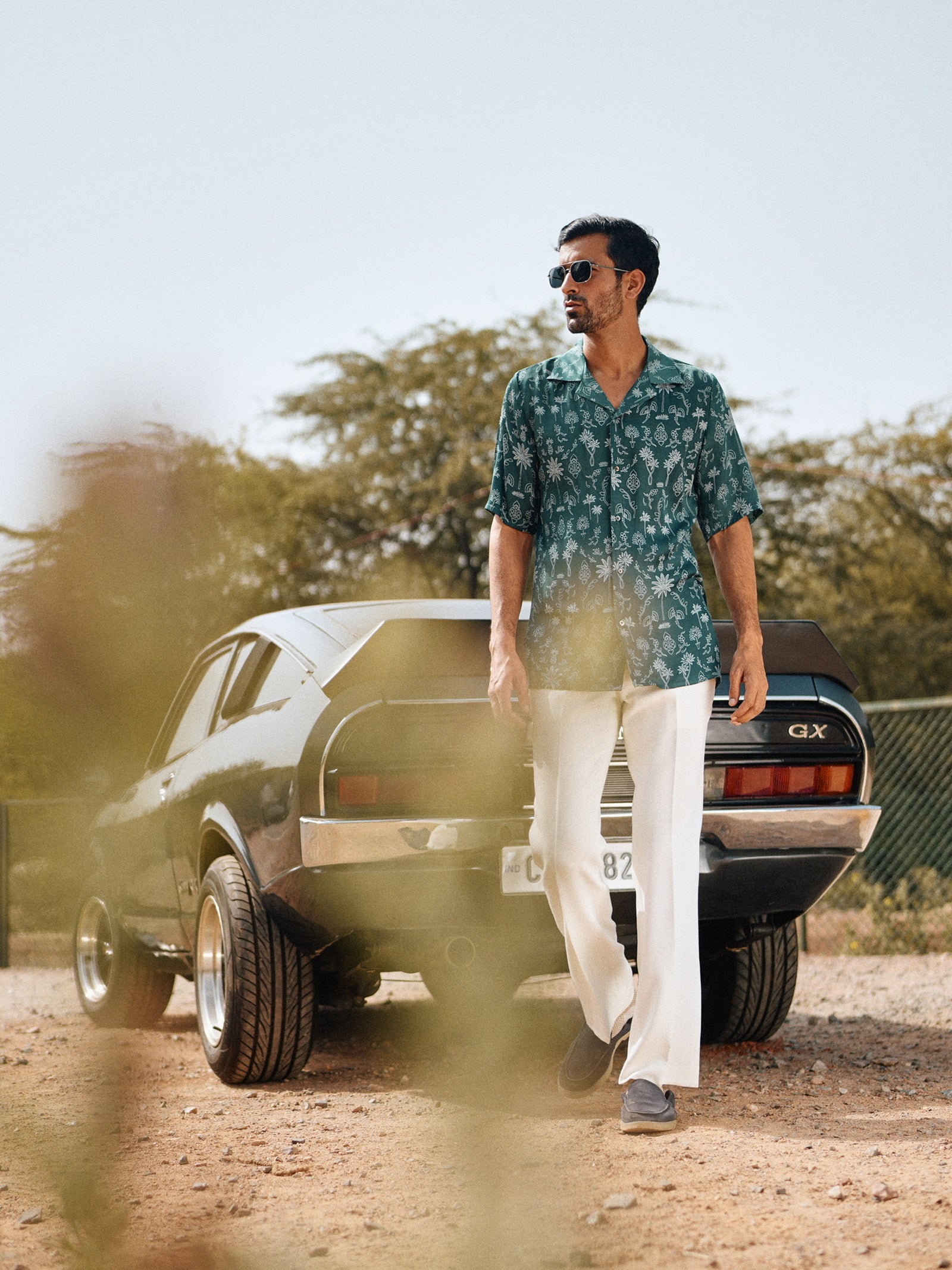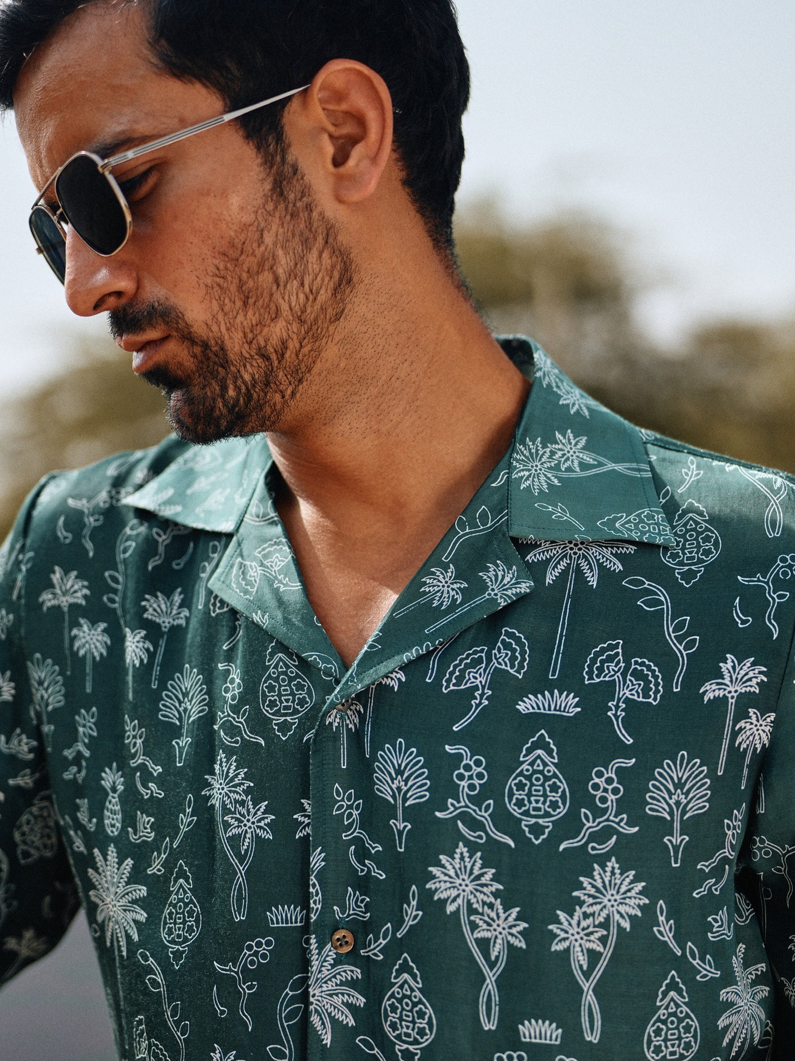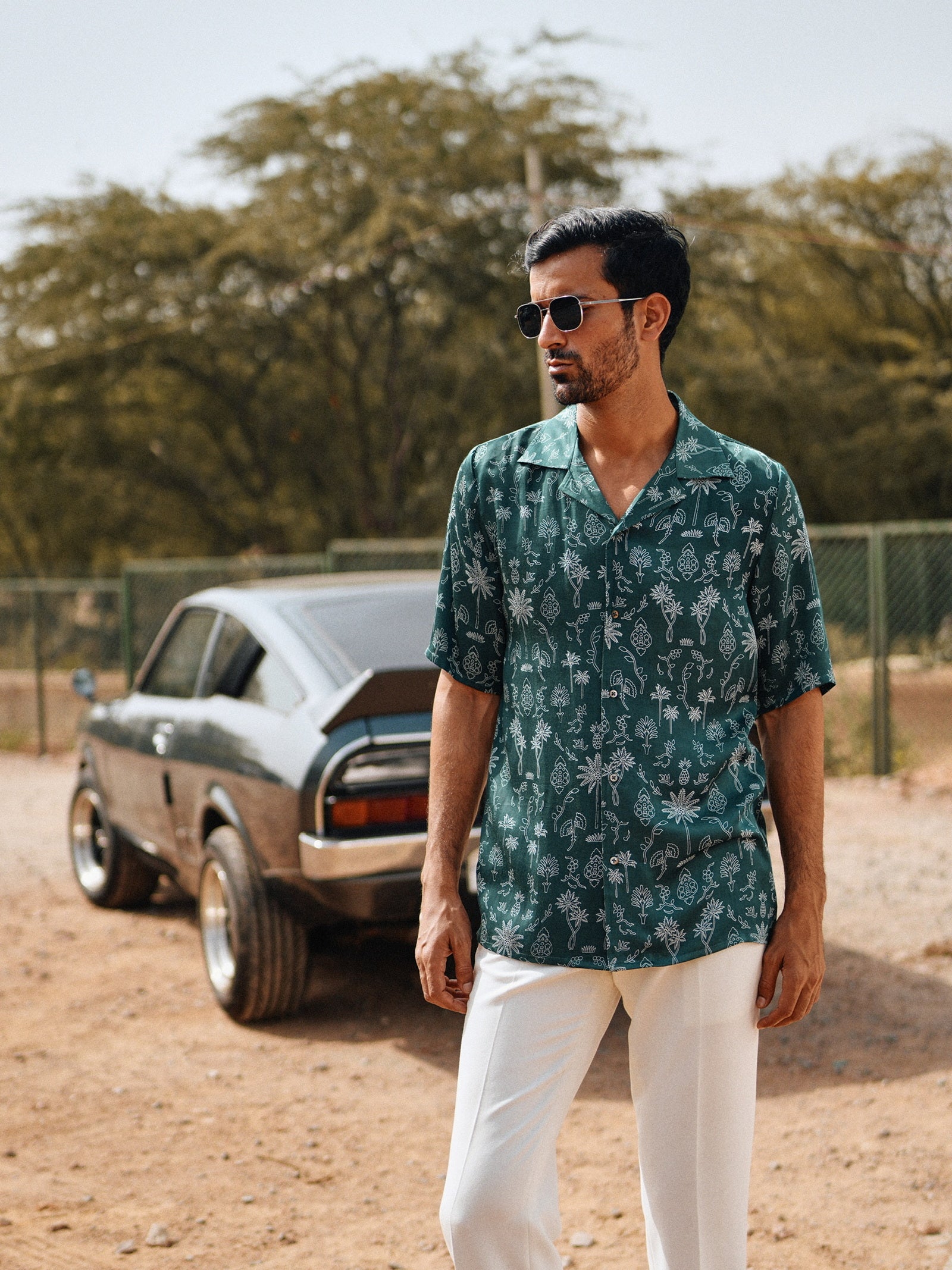 A print that speaks of faraway lands and endless greenery. This short-sleeve shirt is cut for comfort and patterned with flora and fauna, bringing a graphic punch to your resort wardrobe.(Green Shirt with White Botanical Print)