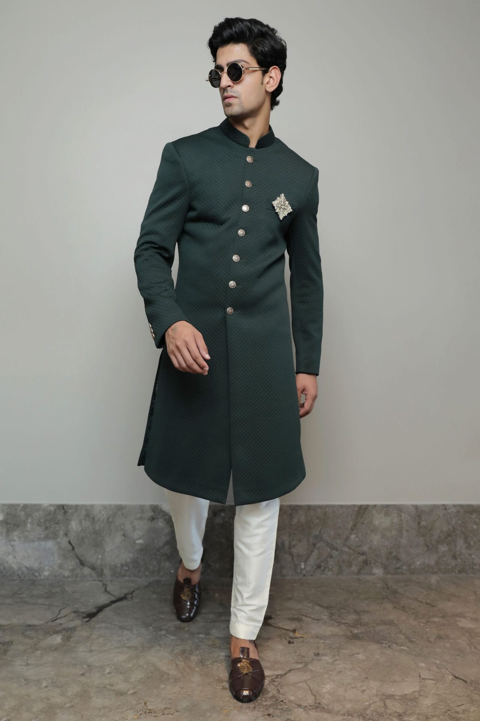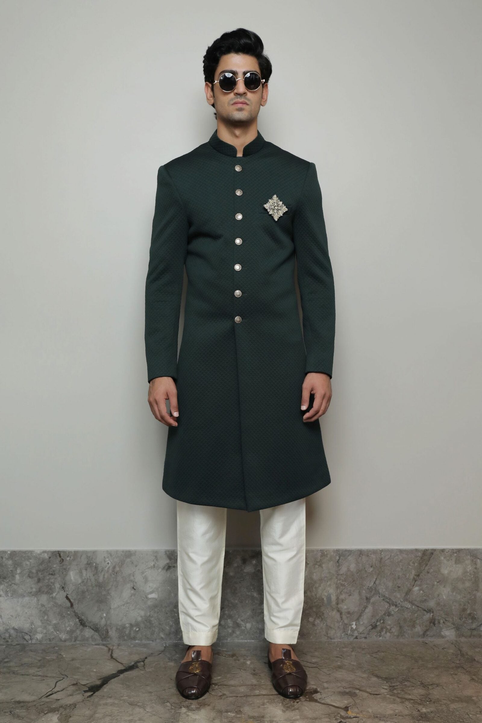 Bottle green Indowestern comes with off-white pant cut pyjamas and an embroidered brooch. Fabric for achkan is Poly lycra, an all-weather fabric with stretch for the comfort fit.