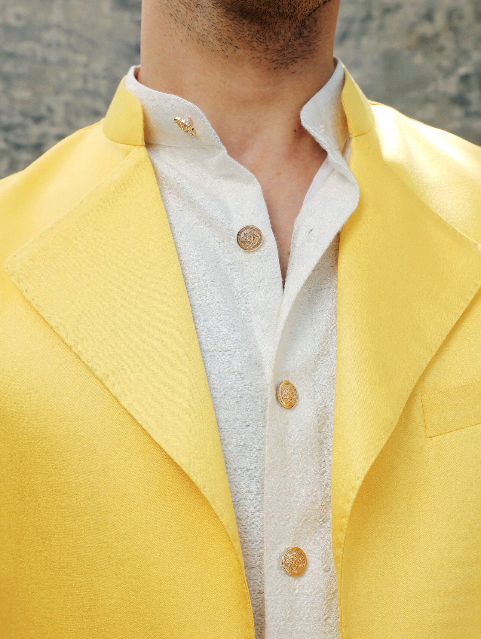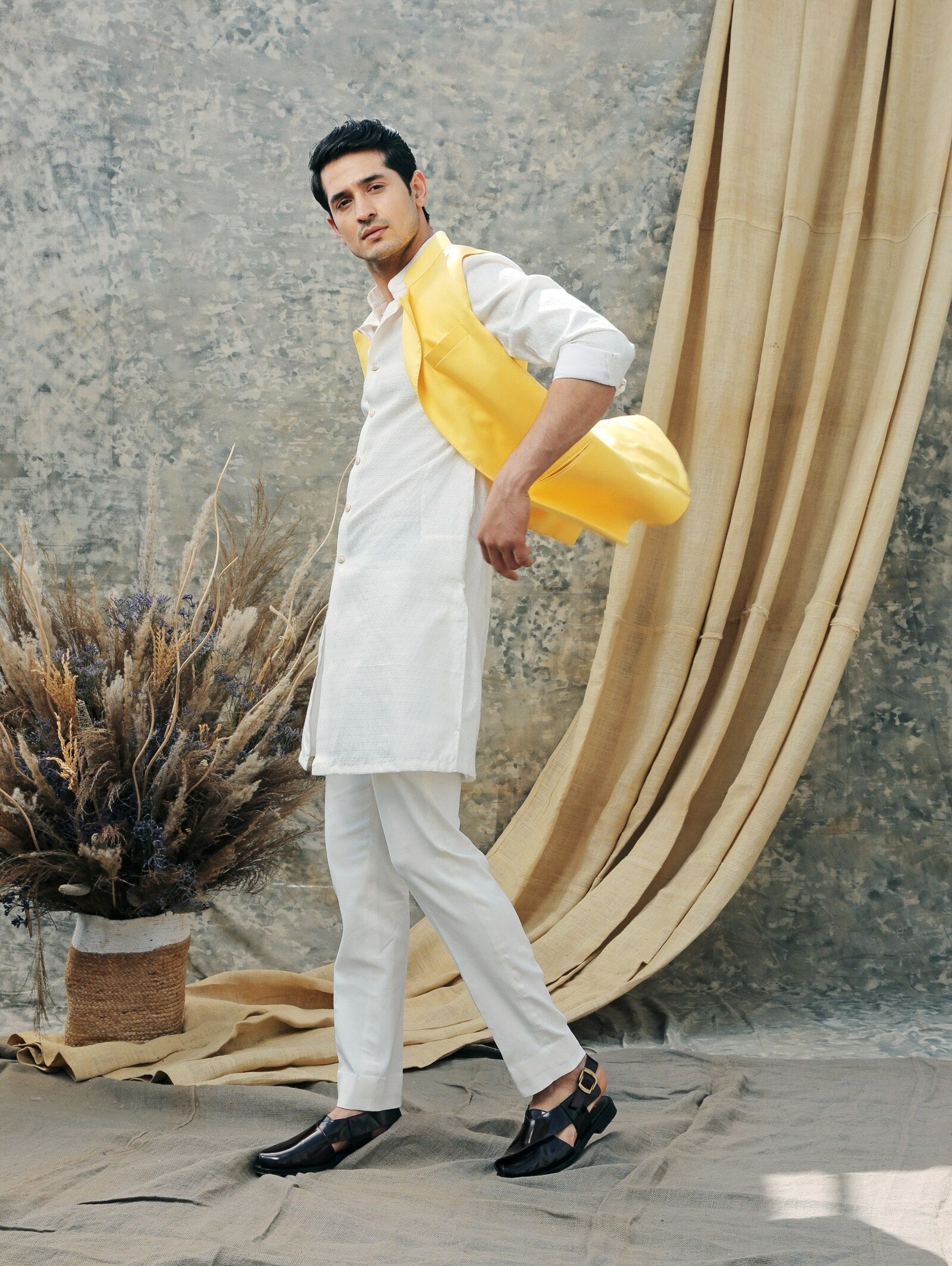 An open bundi with lapel details, comes with a shirt style kurta in self fabric and metal buttons and white trousers.