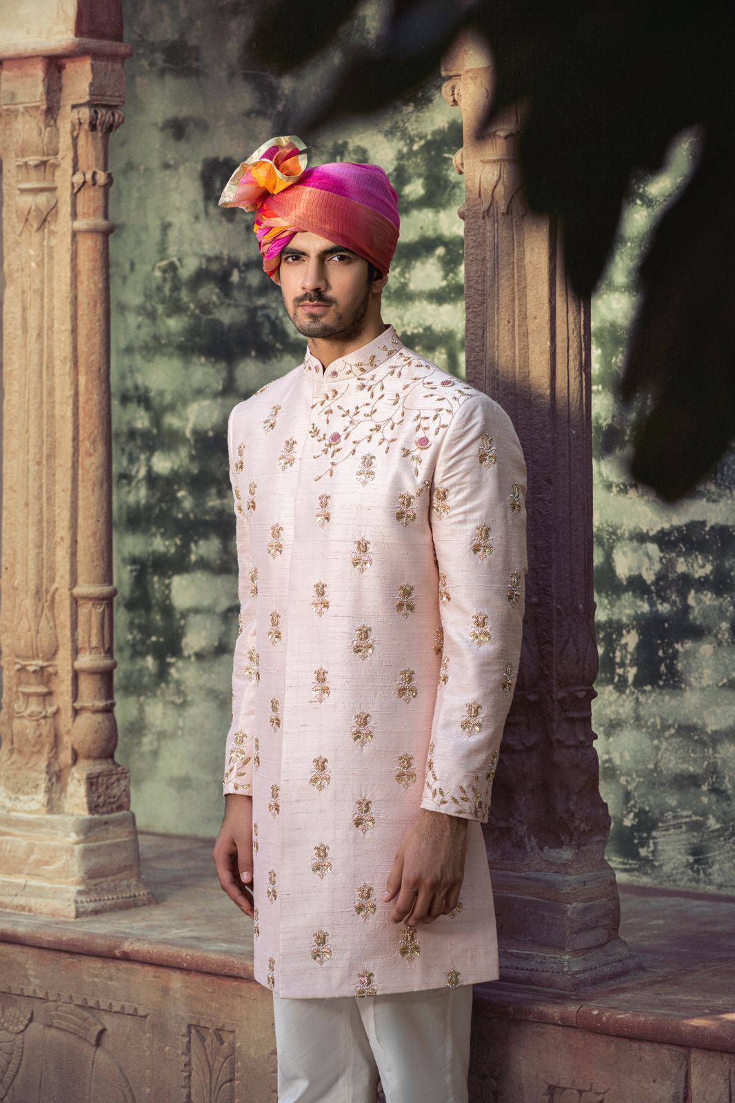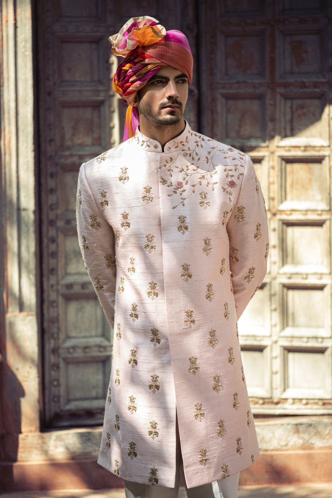 Pink embroidered sherwani with dabka, cut dana & moti work. Embellished with light gold embroidery. Comes with pants, kurtas & accessories.