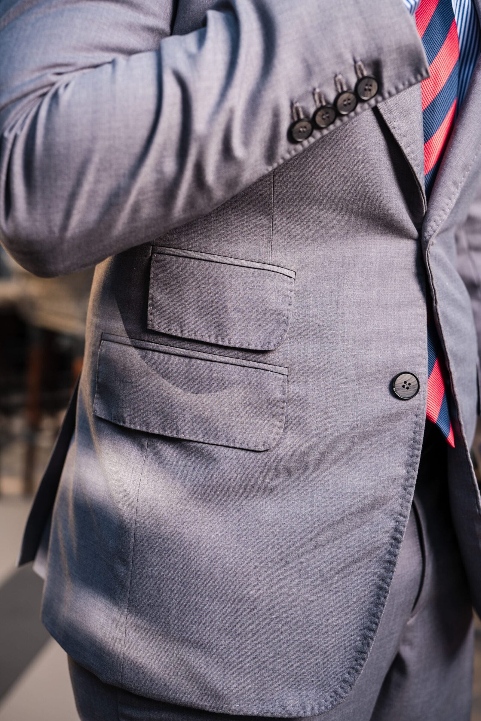 Super 120’s 20% Wool 80%. Polyester Two button ticket pocket detailins with back double vents and high peak lapel. All weather product