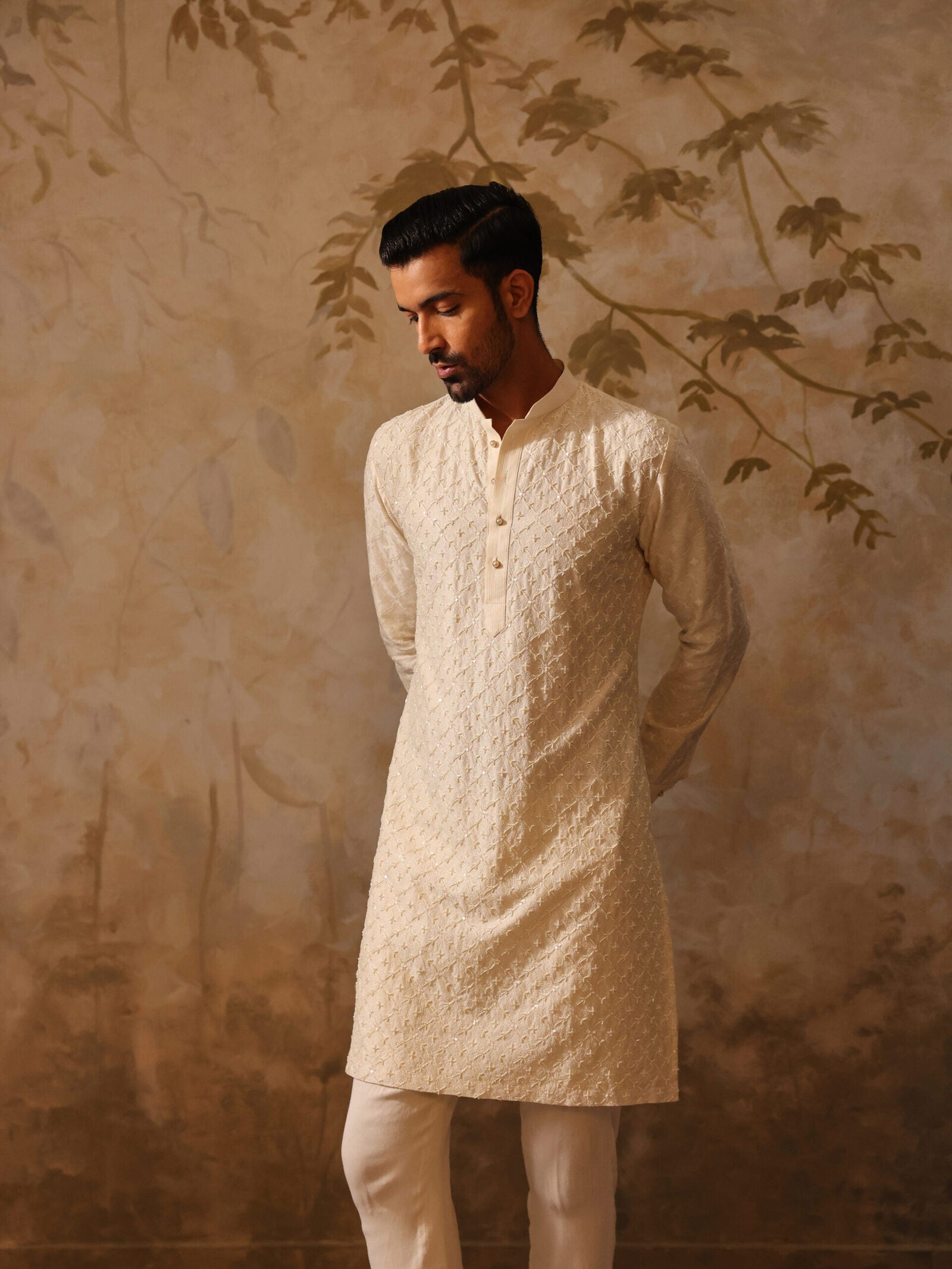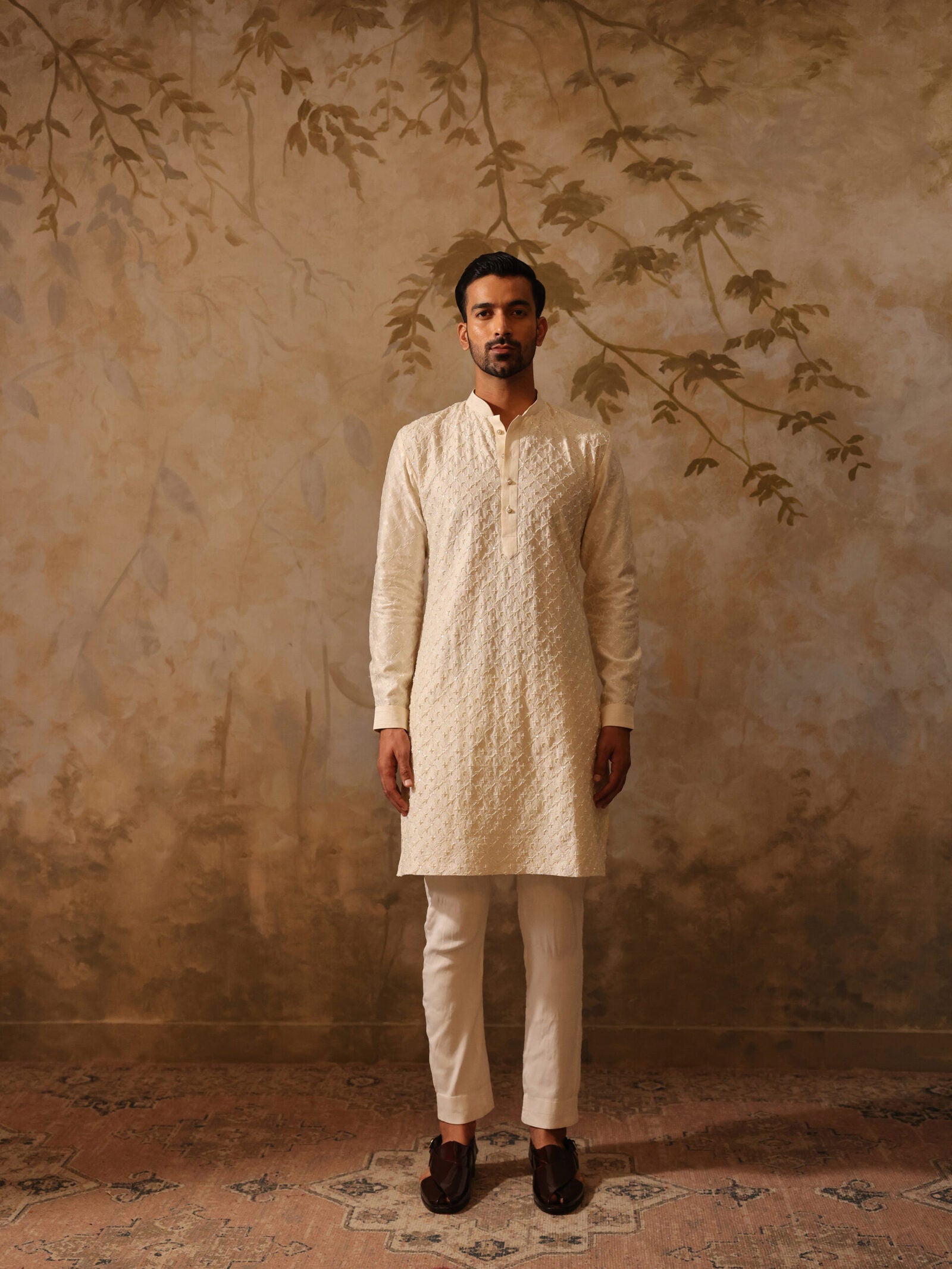 This exquisite ivory chikankari silk kurta showcases intricate hand-embroidered cut dana and moti work on the front, creating a unique and subtle shine. The elegant collar and button strip are adorned with delicate thread work and distinctive pearl buttons, adding a touch of sophistication. Perfect for special occasions, this kurta combines traditional artistry with contemporary elegance, making it a standout piece in any wardrobe.