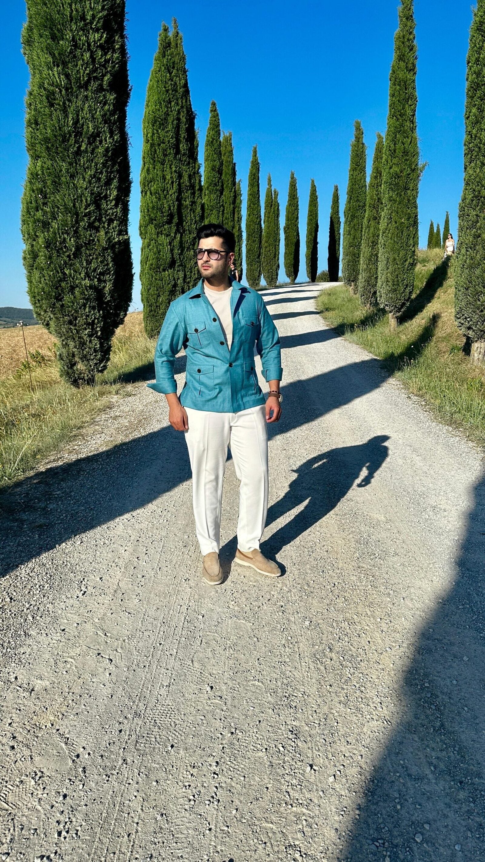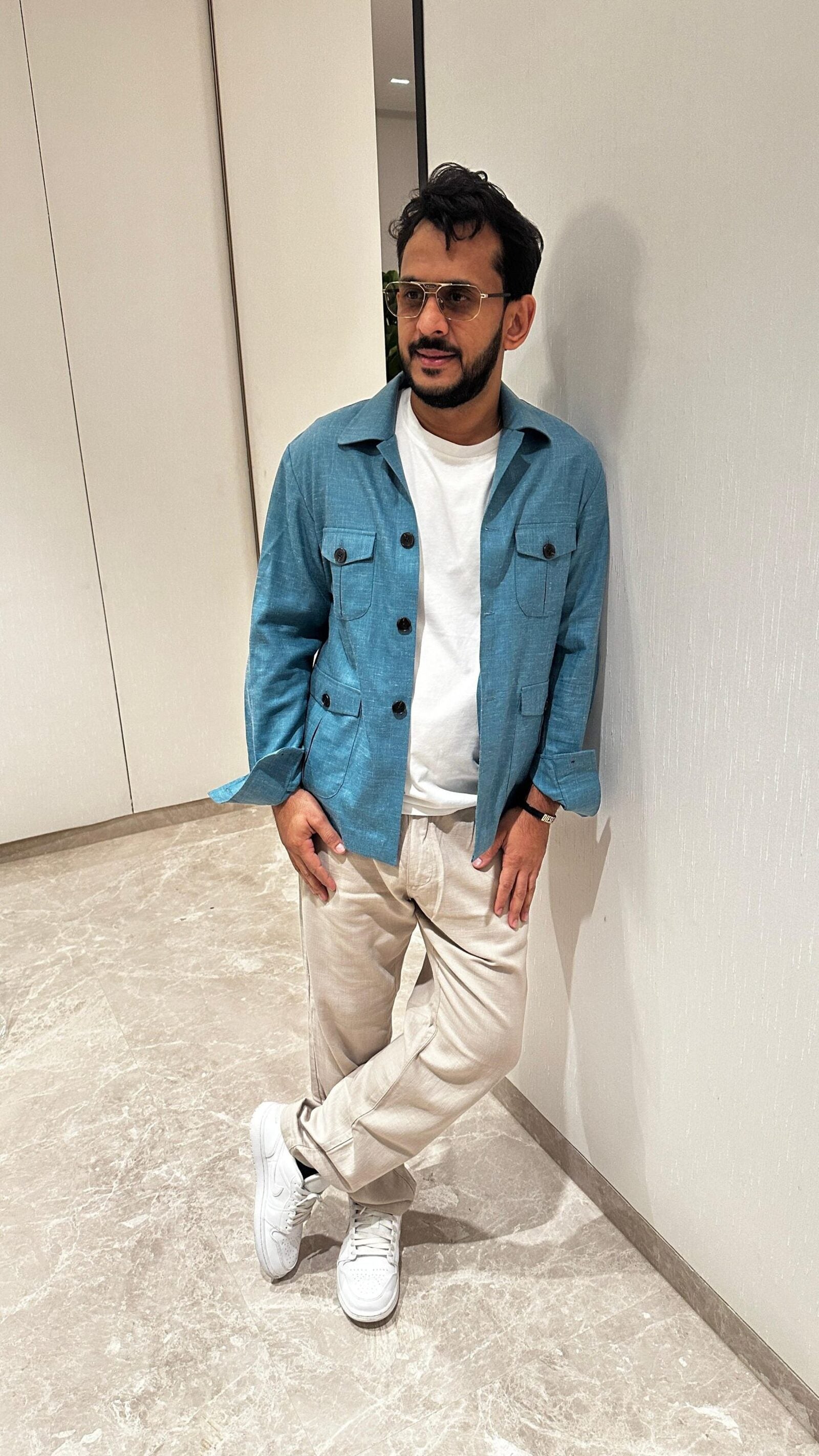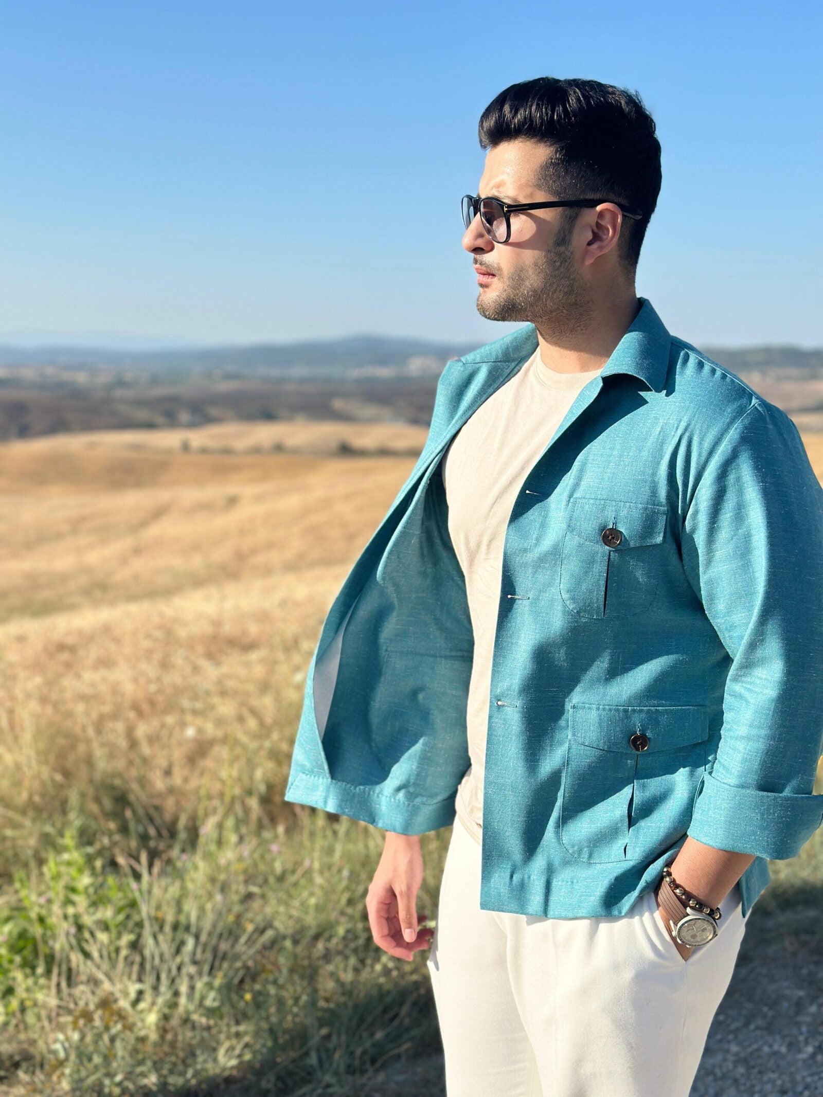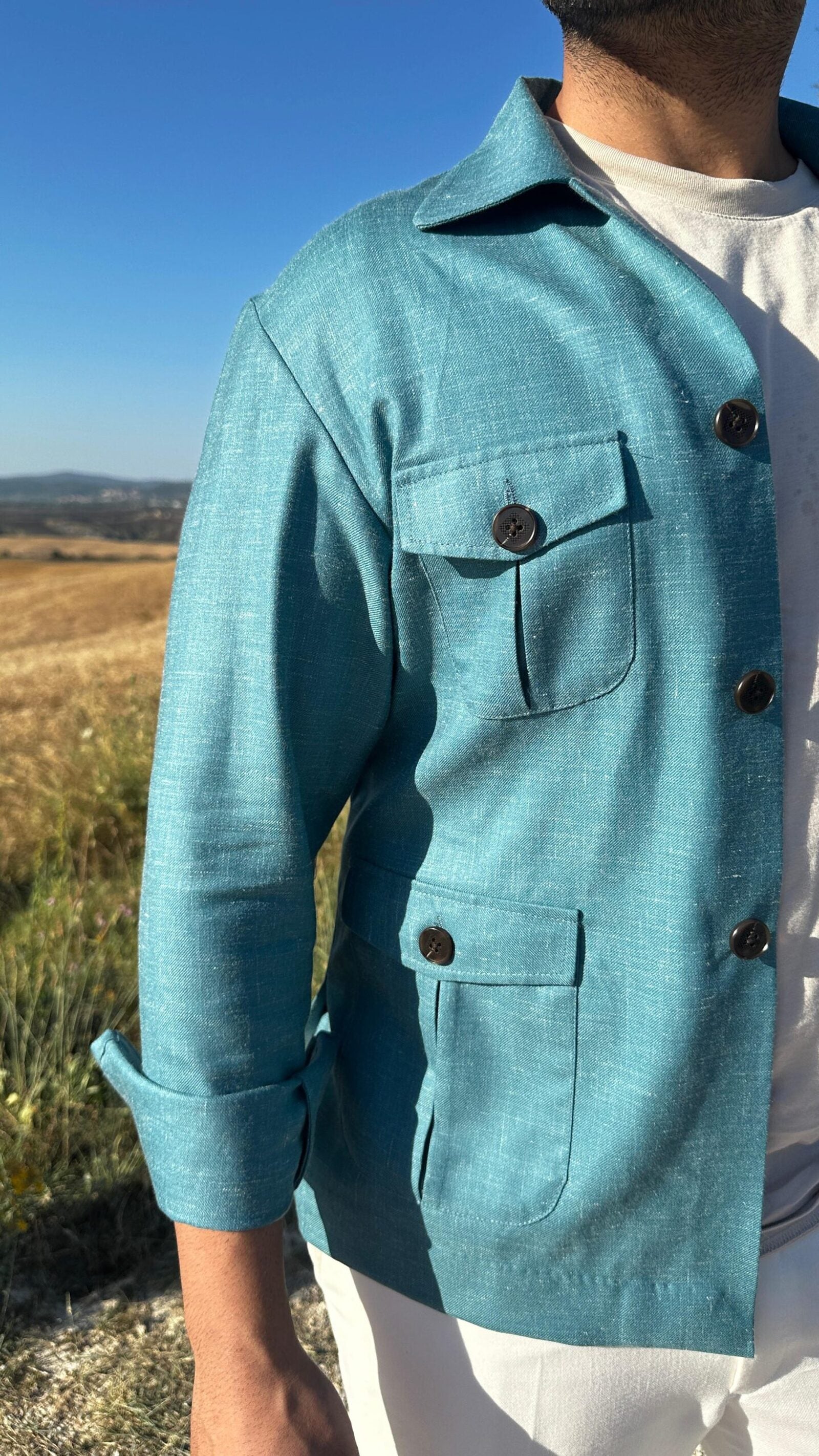 Crafted from a premium linen-wool blend, this versatile shacket doubles as both a lightweight shirt or a stylish jacket. Perfect for warm summer days, it offers breathability to keep you cool and comfortable. Available in a refreshing turquoise color, with customization options available. Orders ship within 7-10 days.