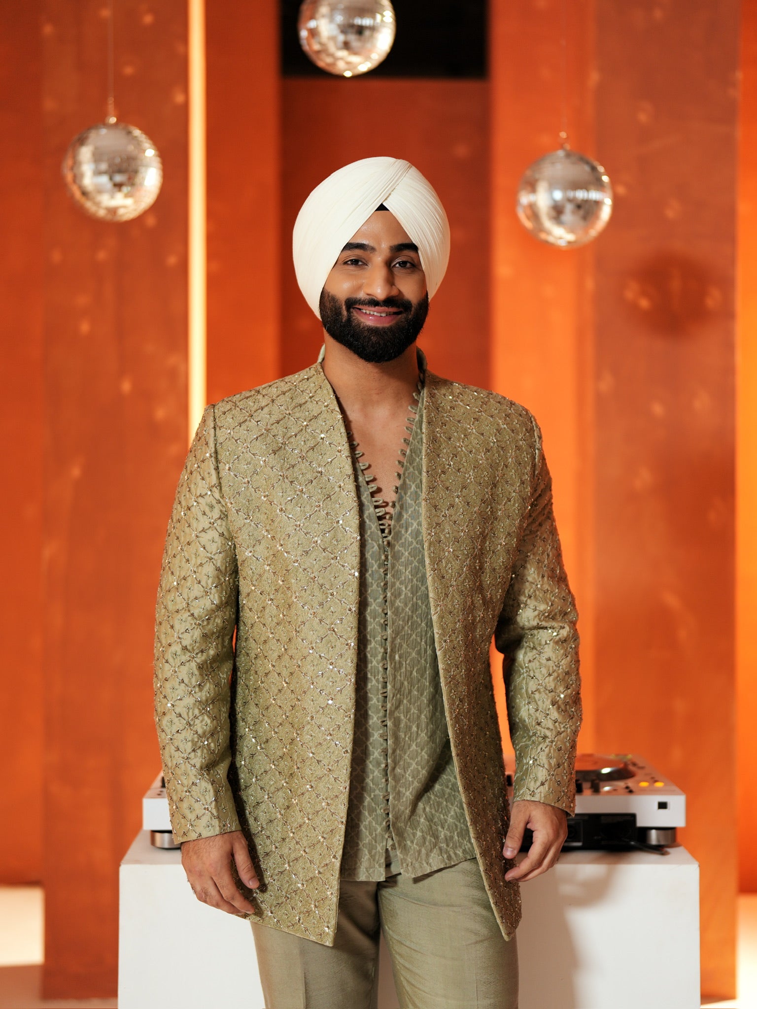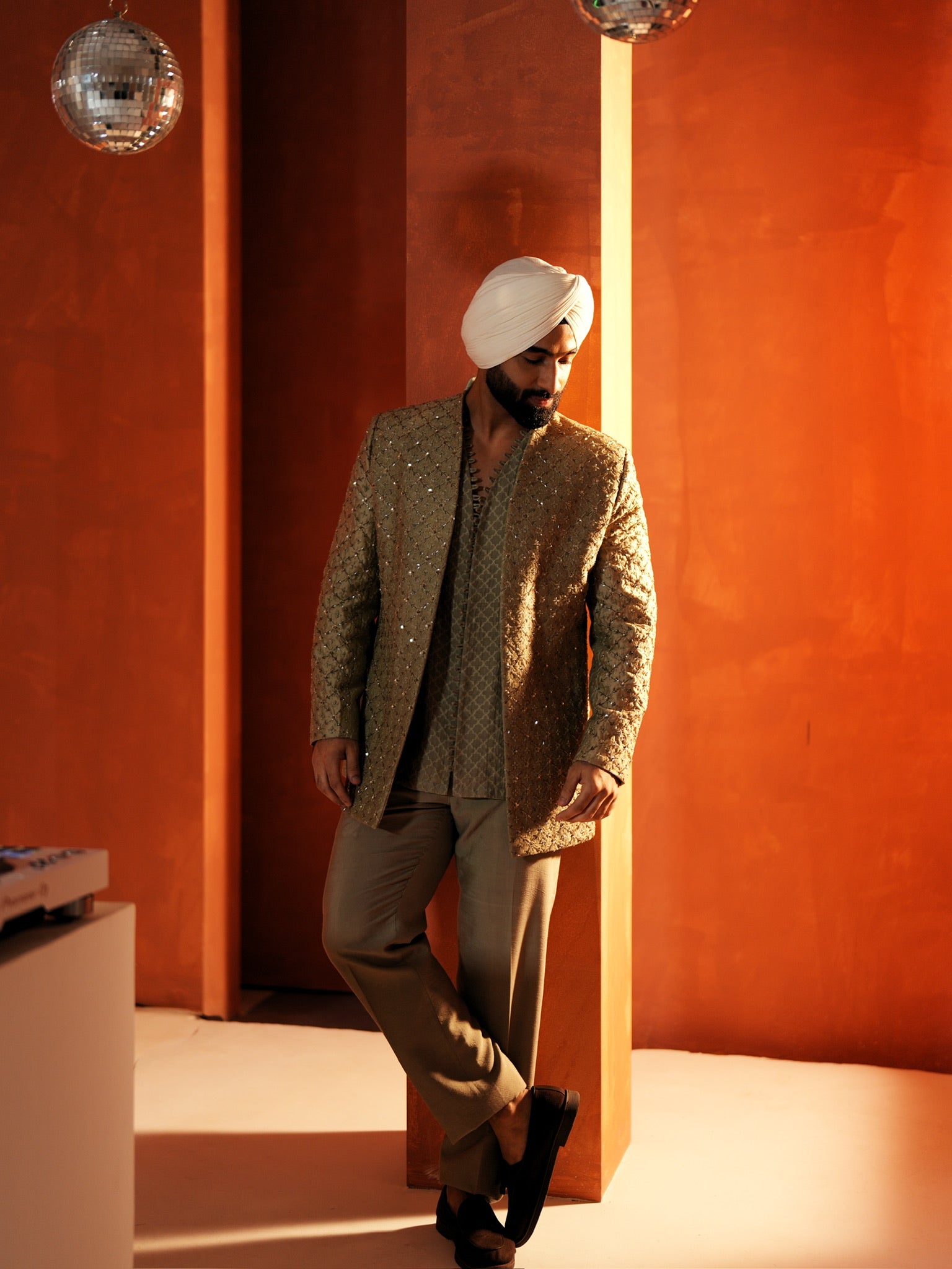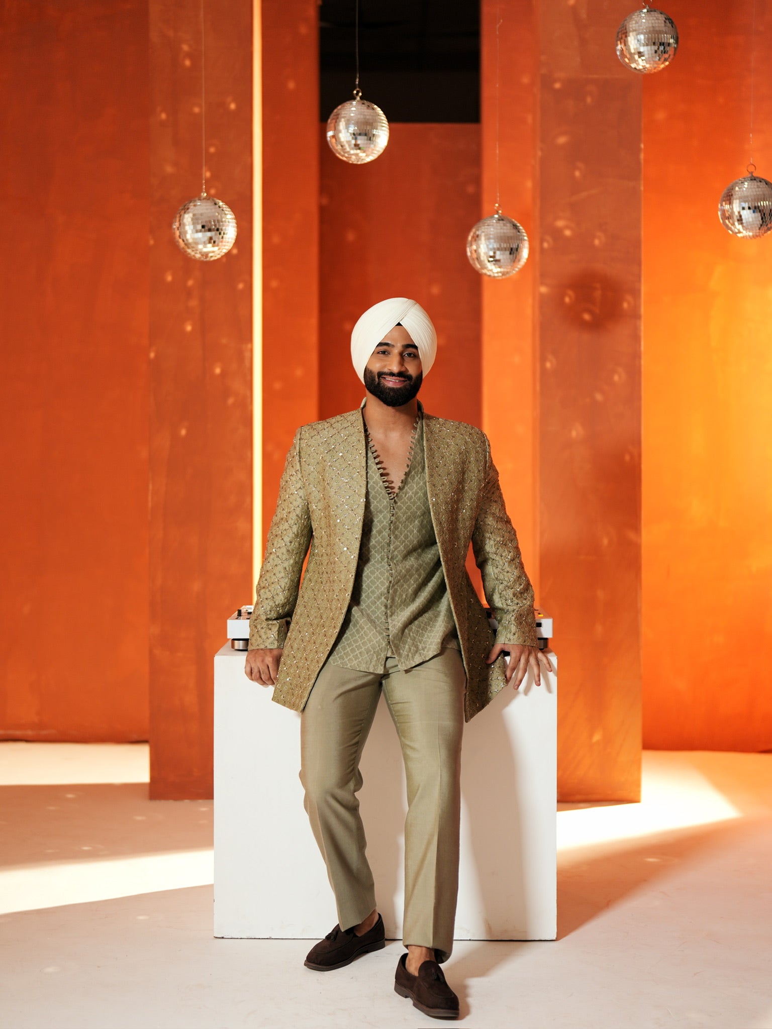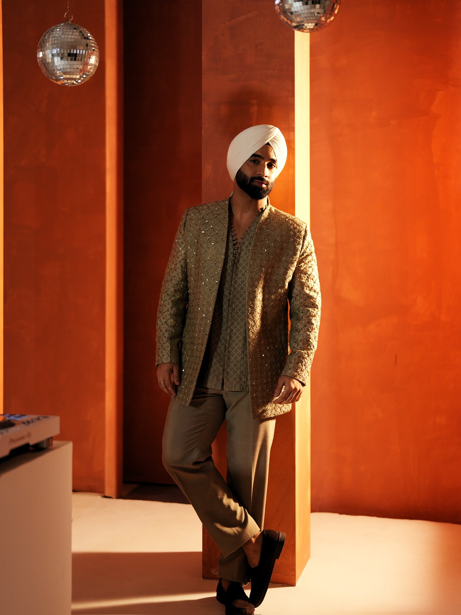 A rich blend of olive tones and antique gold, this statement set features intricate hand embroidery that adds depth, texture, and quiet luxury. The open jacket layers effortlessly over a patterned shirt kurta, creating a refined festive look that moves seamlessly from cocktail evenings to wedding nights. Paired with coordinated trousers, this ensemble balances tradition with contemporary sharpness—perfect for receptions, sangeet, and night celebrations.