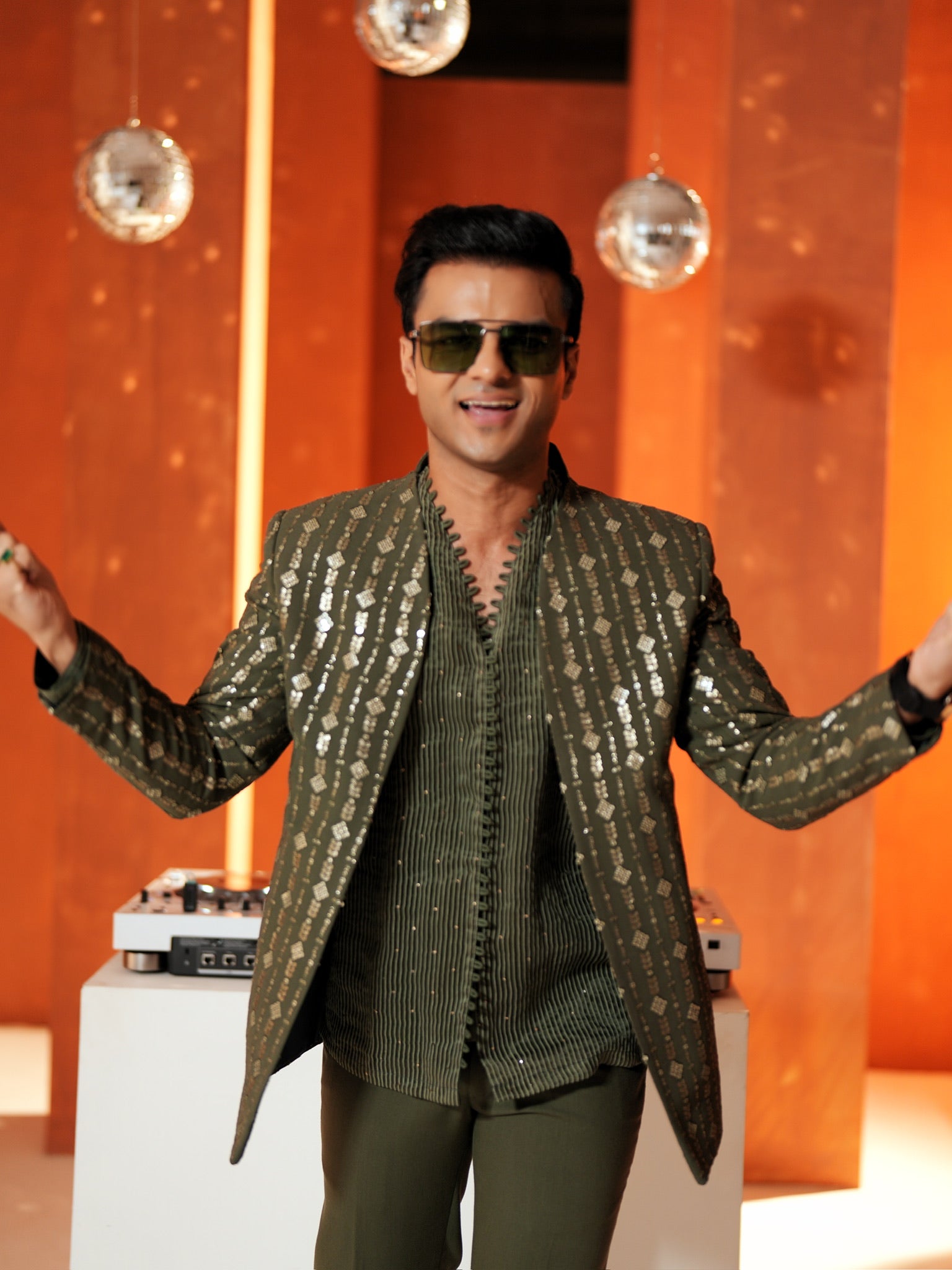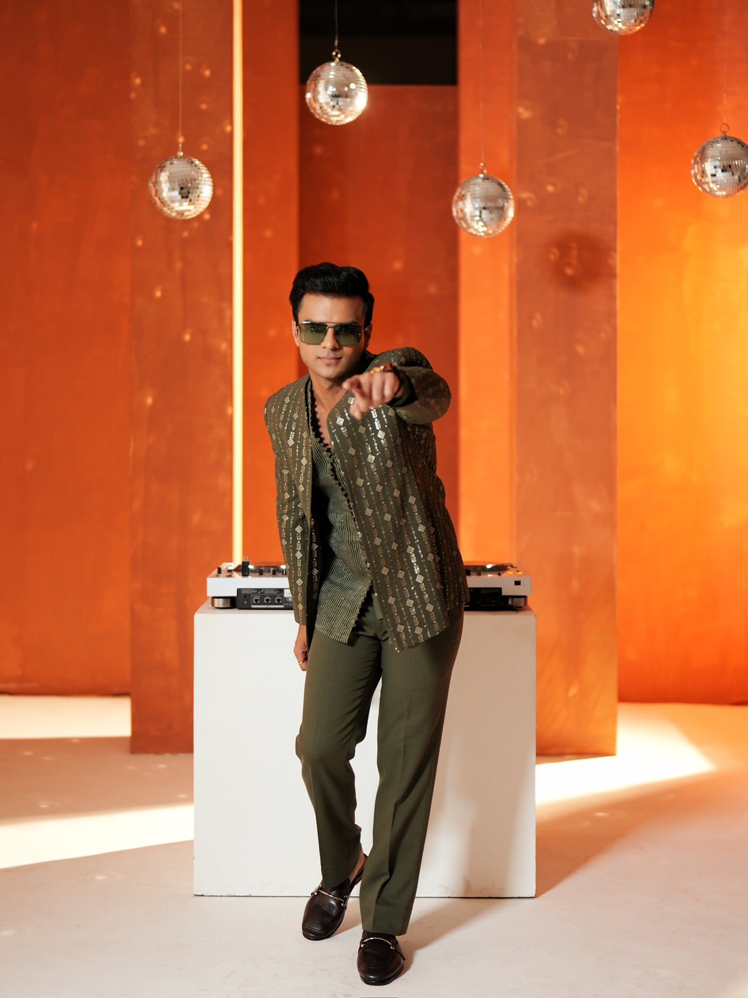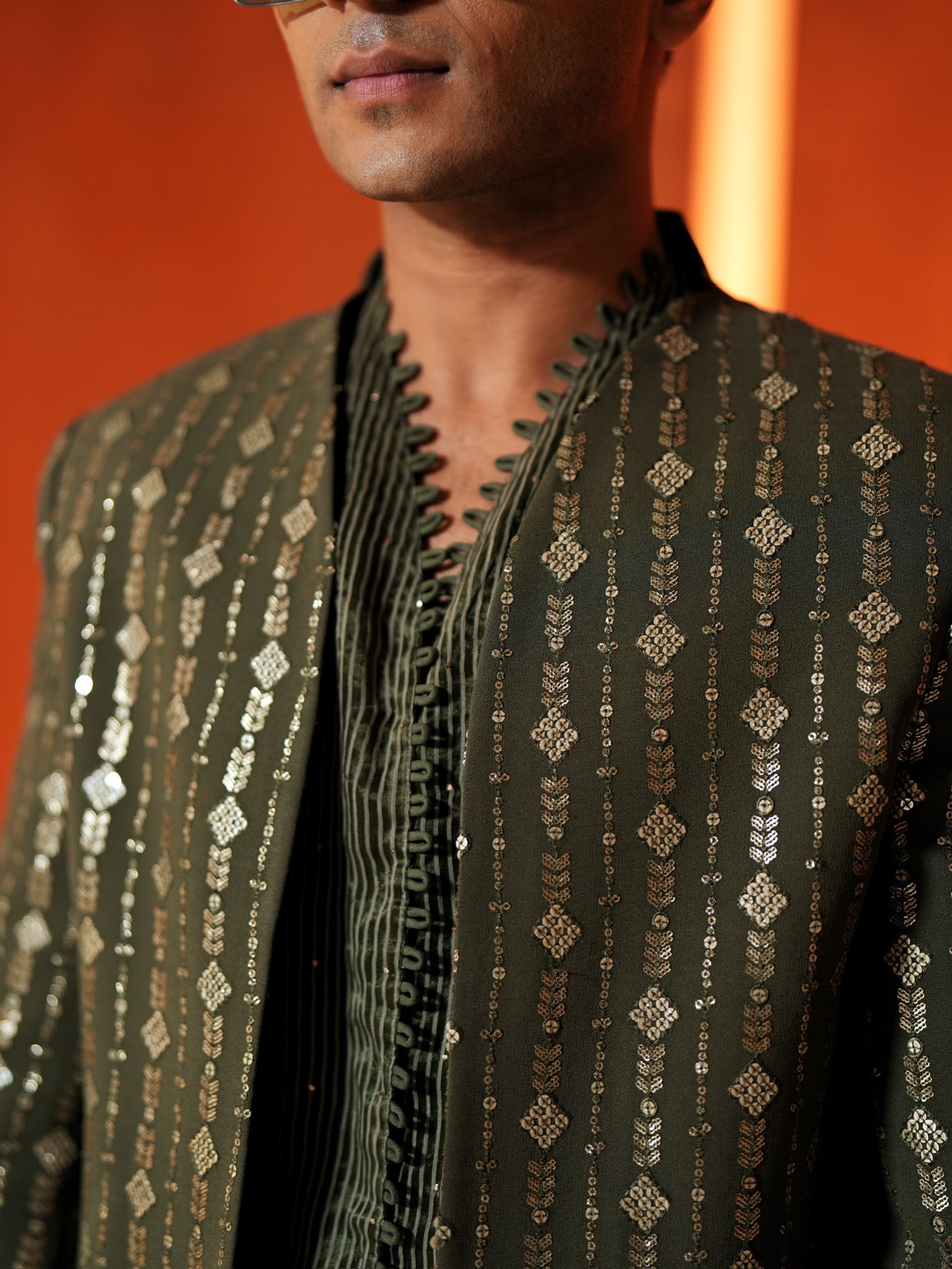 A statement olive Indo-western set featuring a stripe embroidered jacket with sequin work, layered over a textured shirt-style kurta highlighted with mukaish detailing, and paired with olive stretch pants for comfort and sharp tailoring. The play of shimmer from sequins and the subtle sparkle of mukaish creates depth under evening lights, making this outfit ideal for mehendi nights, sangeet, cocktail functions, and wedding celebrations.