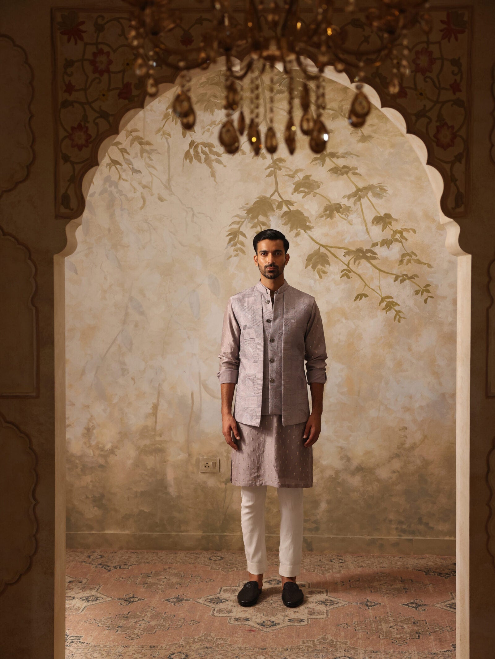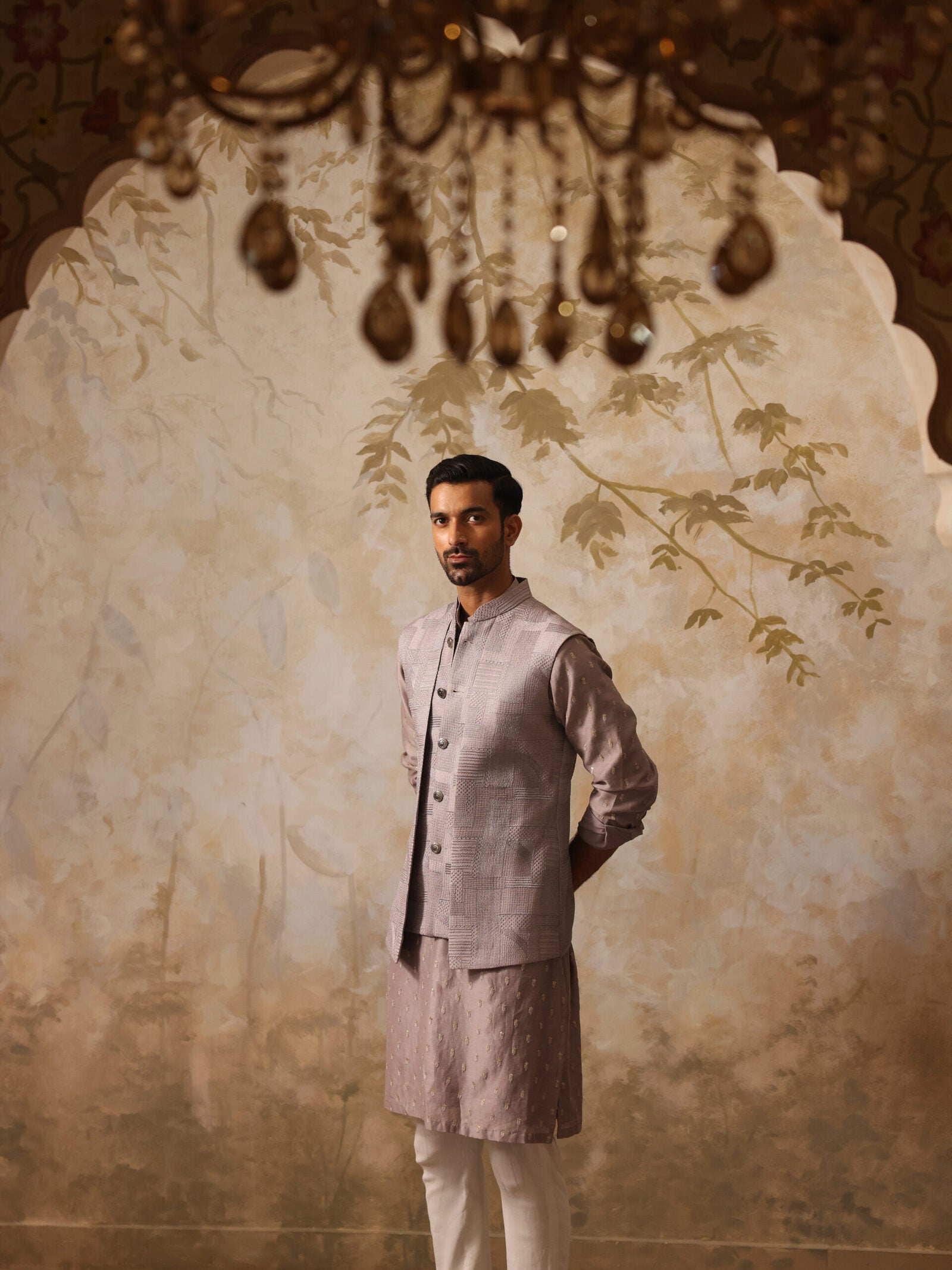 This sophisticated greyish lilac Nehru jacket features exquisite embroidered threadwork that adds a touch of artistry to its refined design. The paneled detailing enhances its silhouette, creating a modern yet classic look. Perfect for formal occasions or festive celebrations, this jacket effortlessly combines elegance and contemporary style, making it a standout piece in any wardrobe.