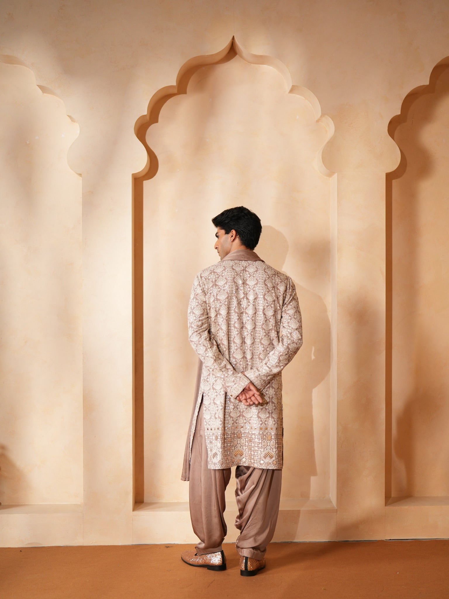 A statement in soft sheen and intricate detailing, this rose gold kurta is paired with a complementing stole that adds fluid elegance to the look. The subtle shimmer and refined craftsmanship make it ideal for graceful festive dressing with a contemporary edge.