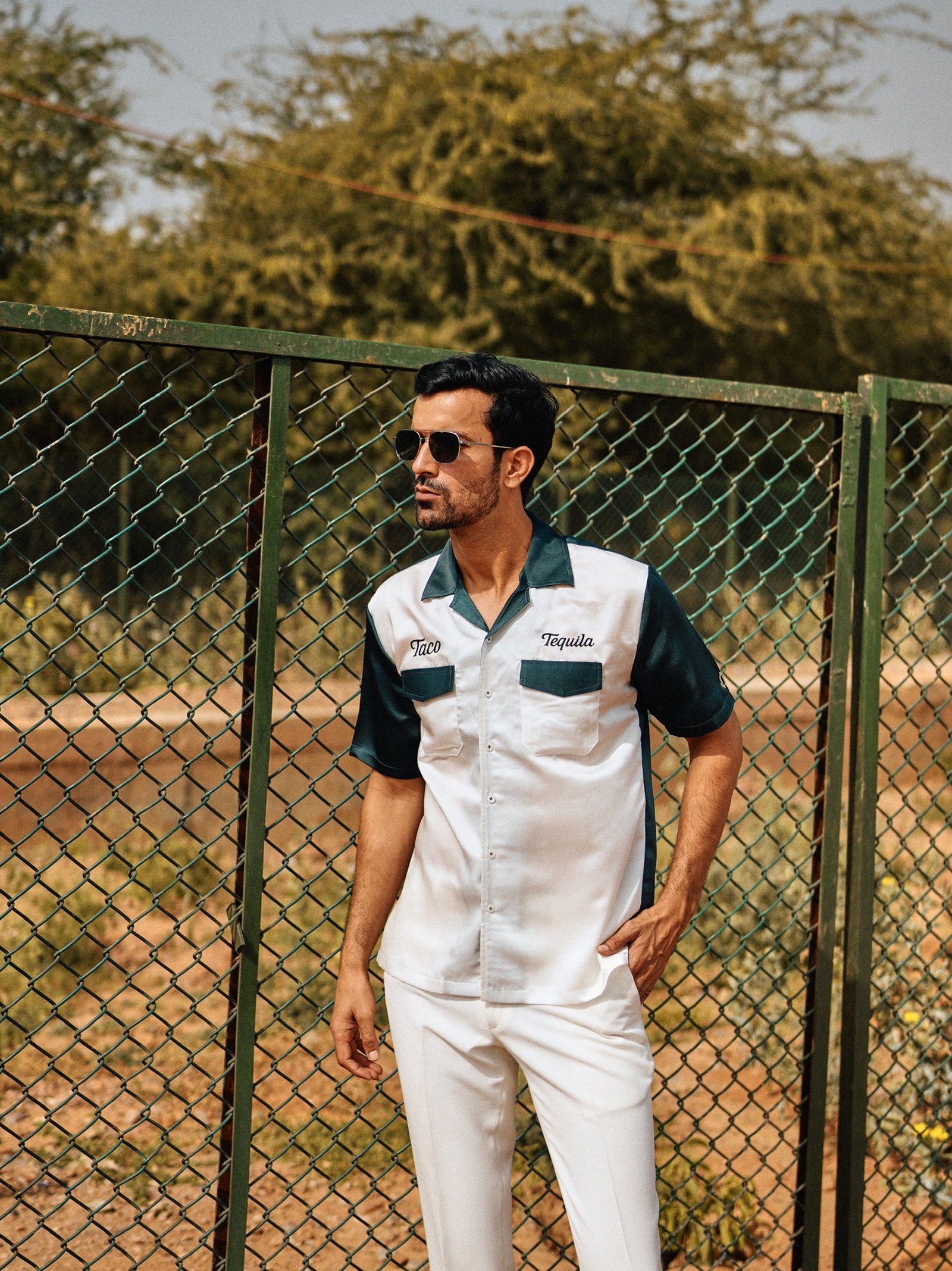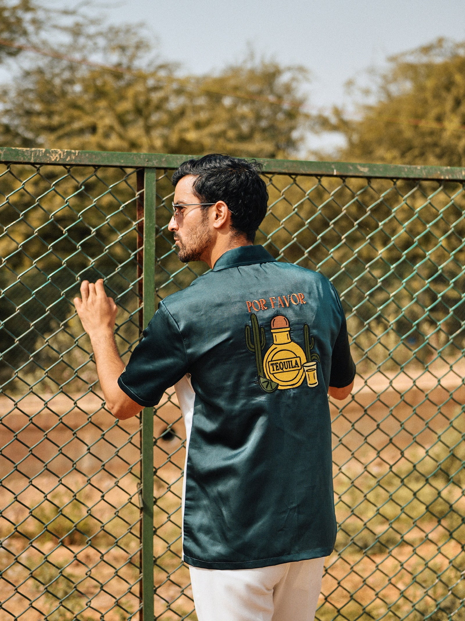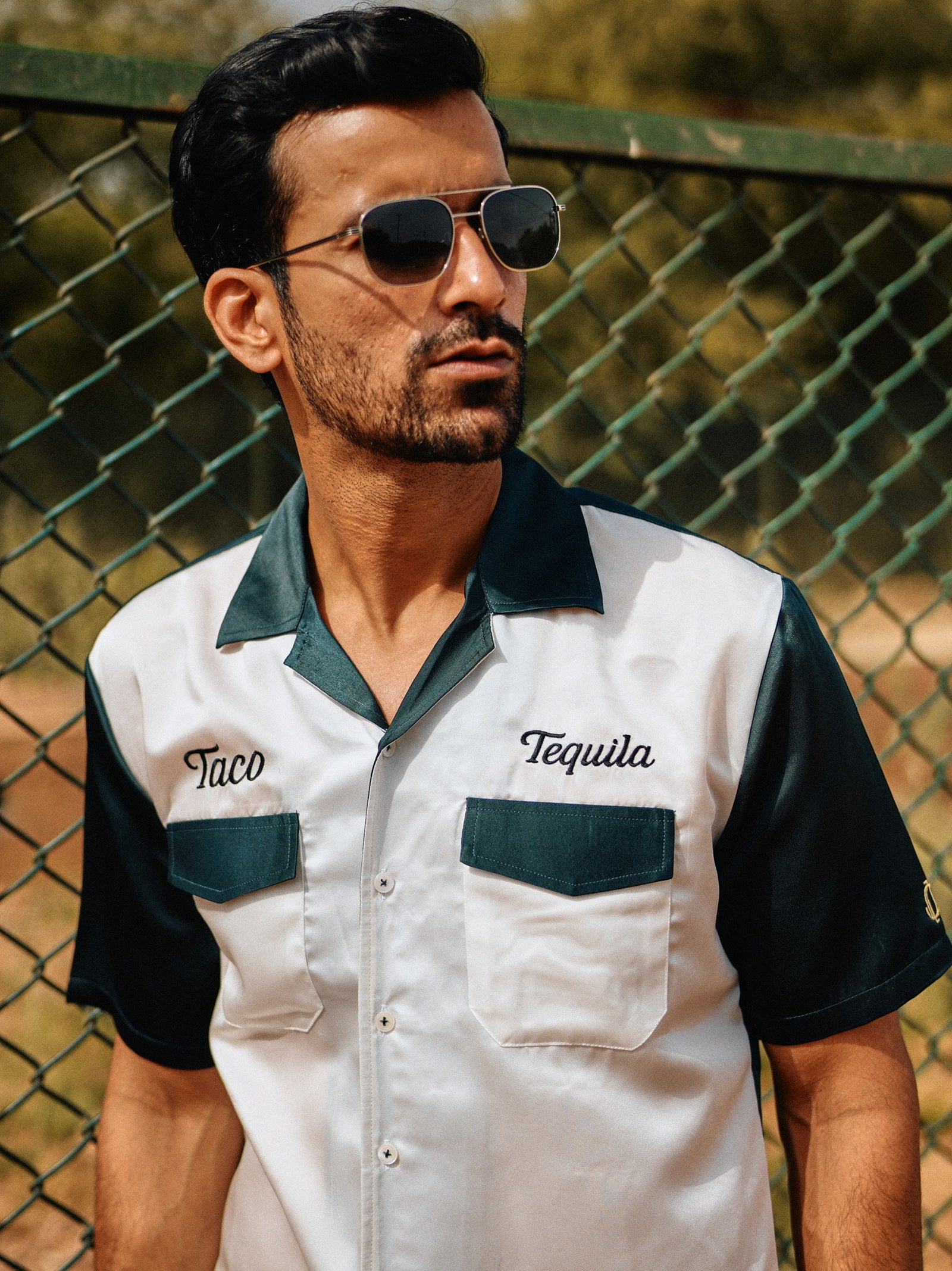 A playful reinterpretation of the retro Cuban collar shirt. Embroidered with “Taco” and “Tequila” up front and a bold tequila graphic at the back, this satin-finish shirt is your invitation to laid-back revelry.(Green & White Bowling Shirt – Front Embroidery: “Taco / Tequila”)