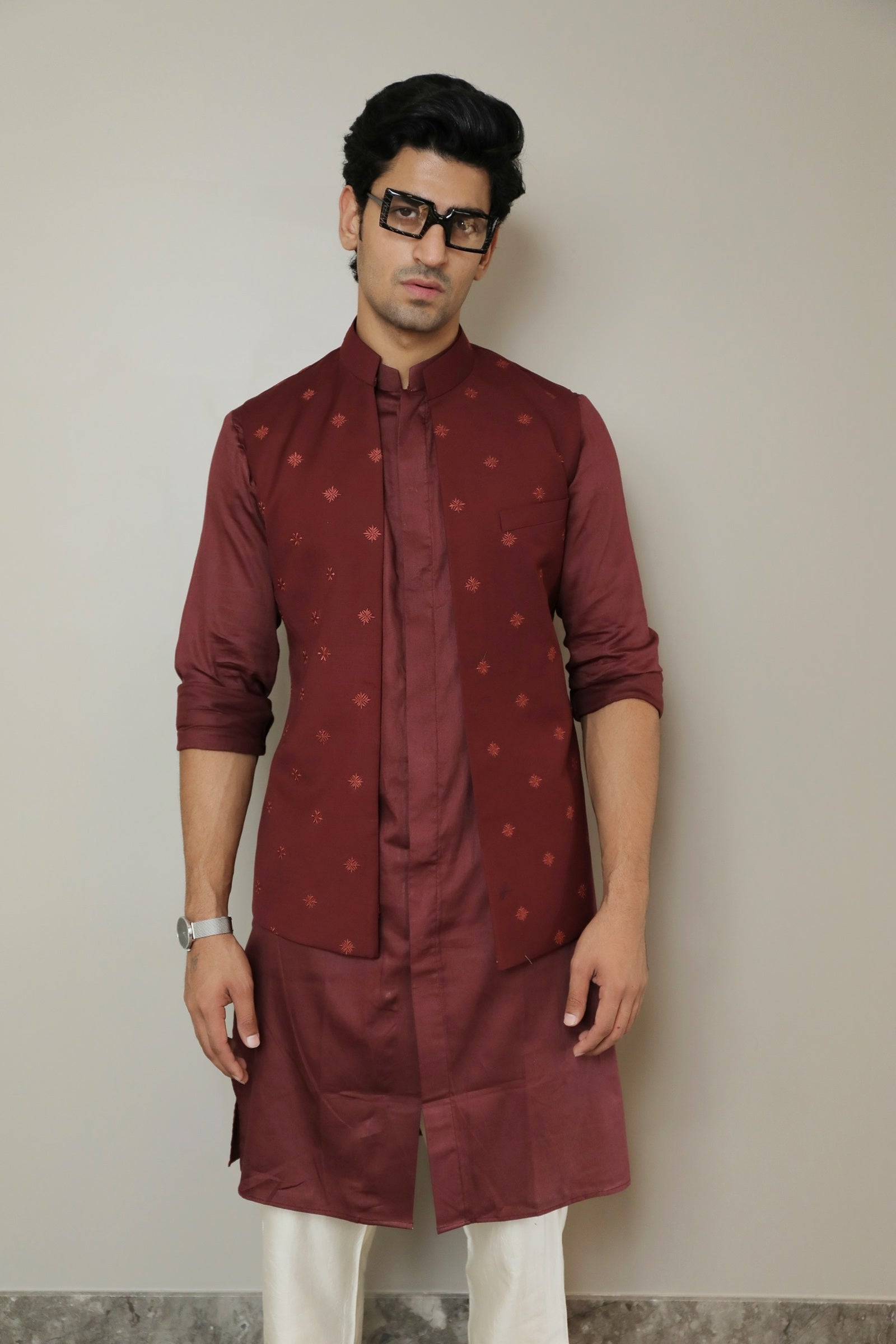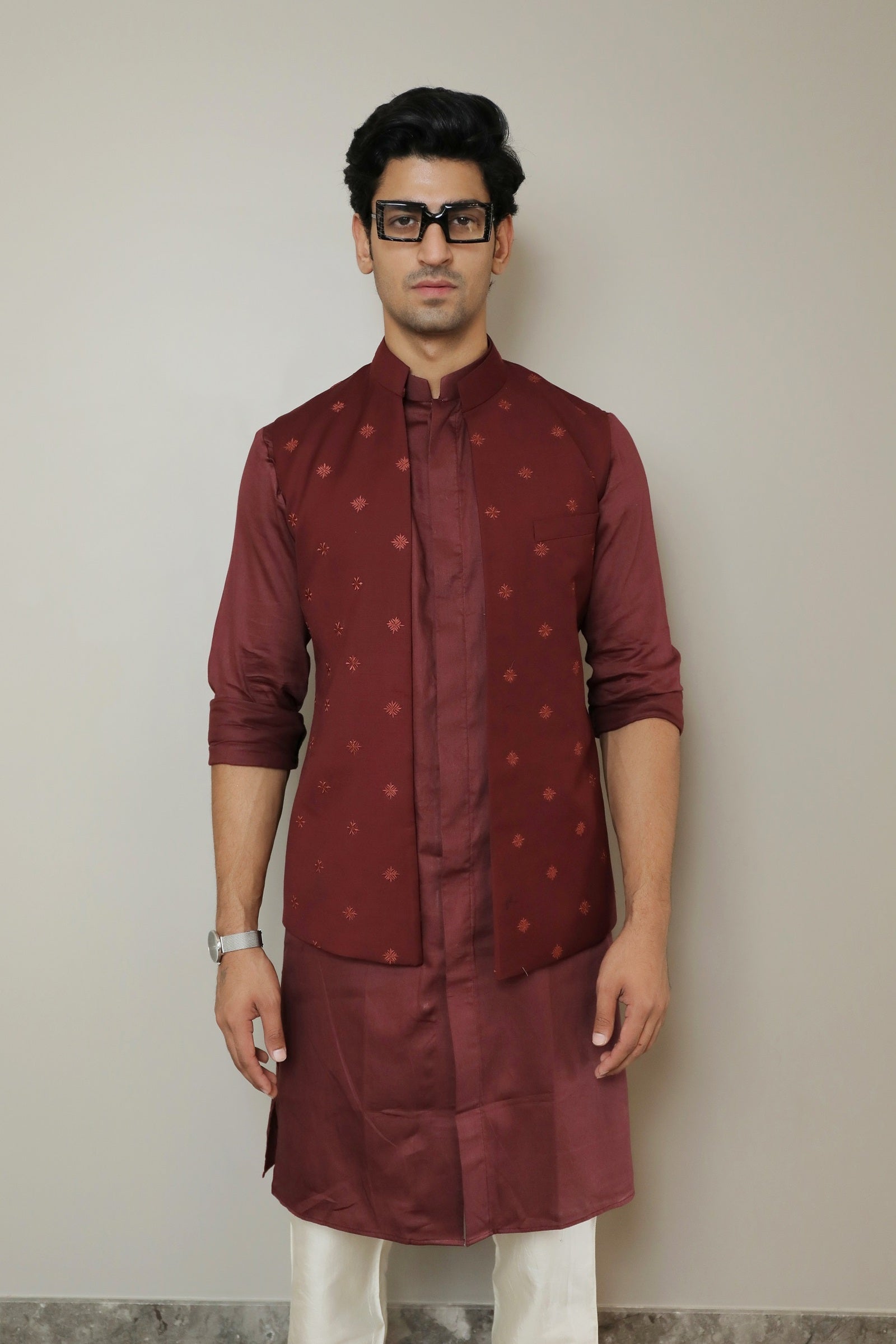 Wine embroidered open jacket with shirt style kurta and off white pant cut pajama.